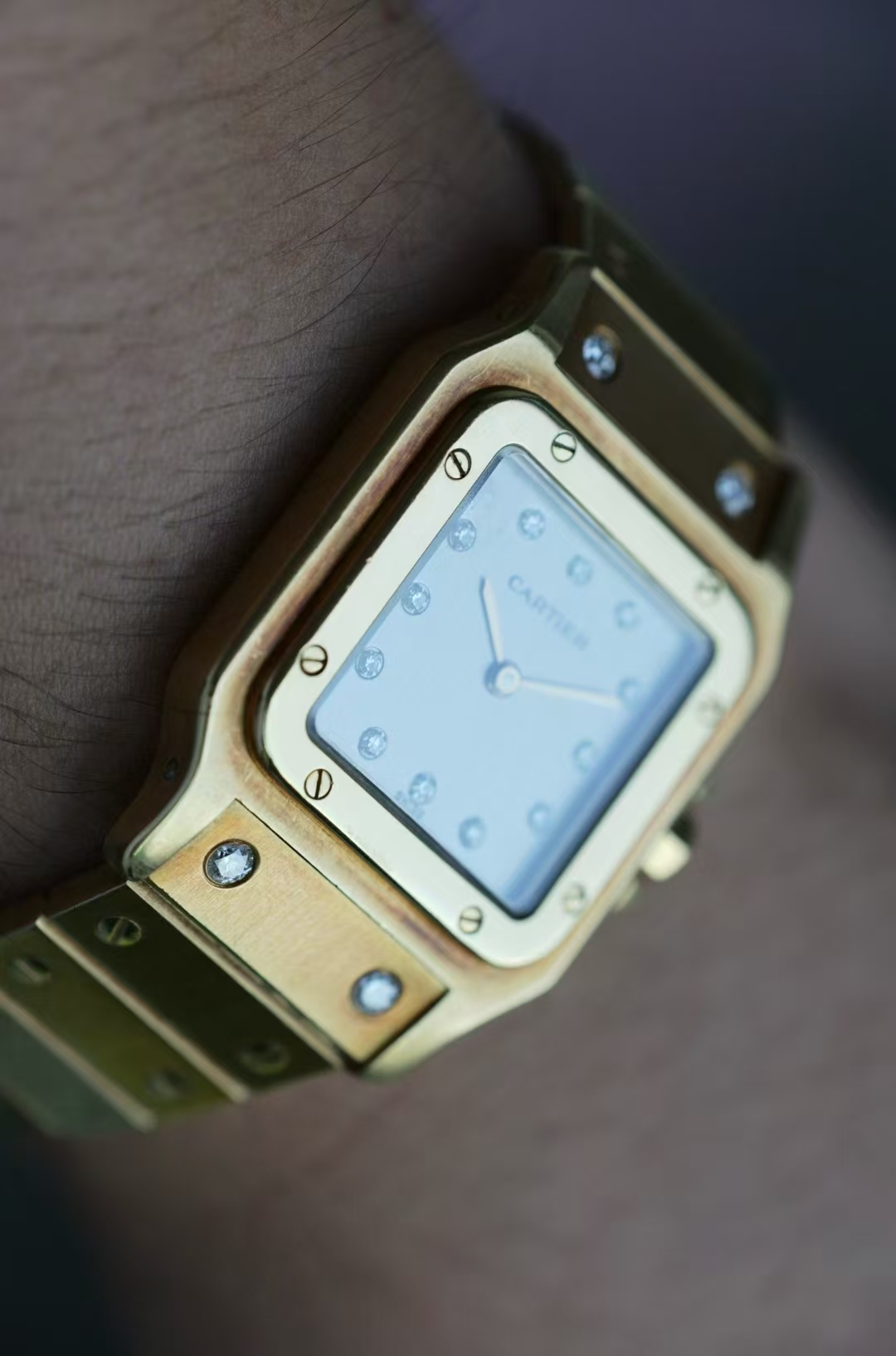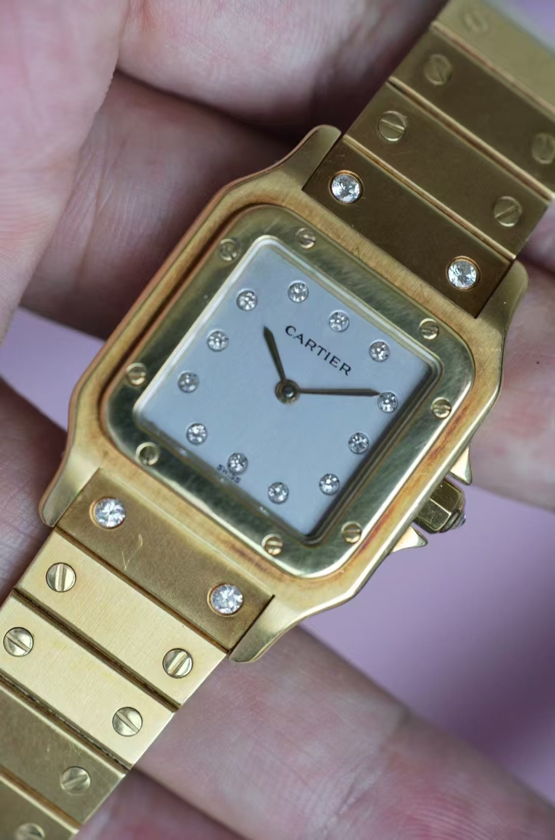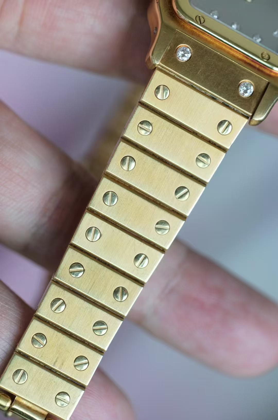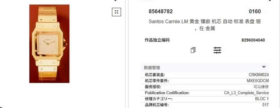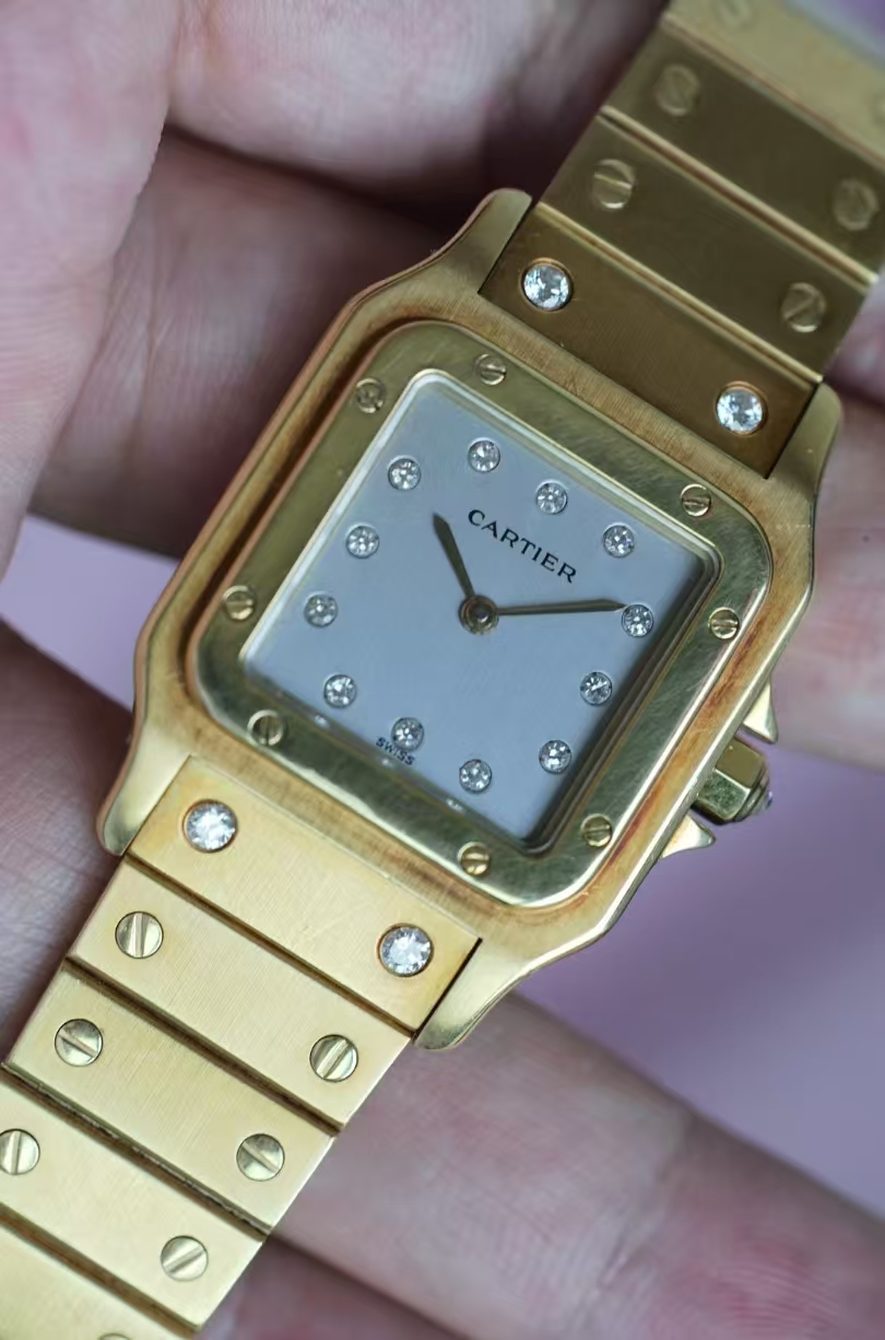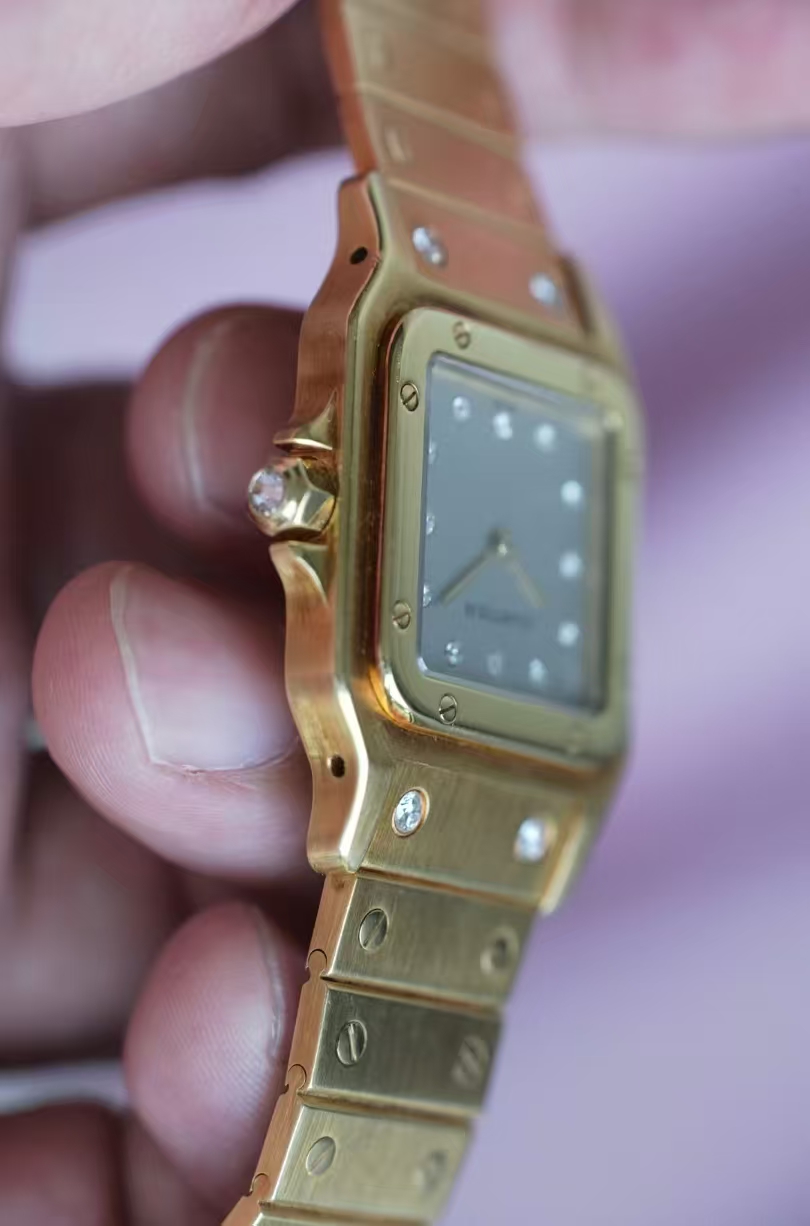 首页 > 卡地亚|CartierSANTOS DE CARTIER 卡地亚山度士2960 整表原钻 自动机械 大号 29X41mm表径 产于上世纪七十年代,钻刻鬼面,全18K金材质,腕周180mm,表节不够可以买,查码都对期,懂得来问,不多介绍。