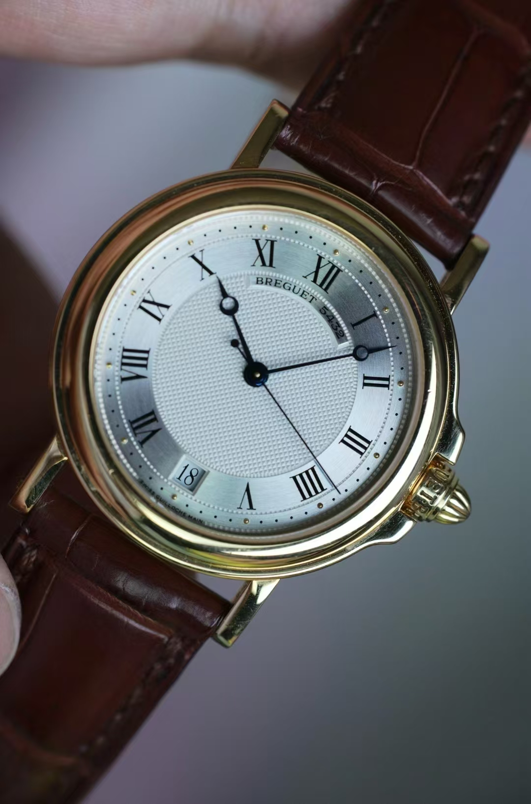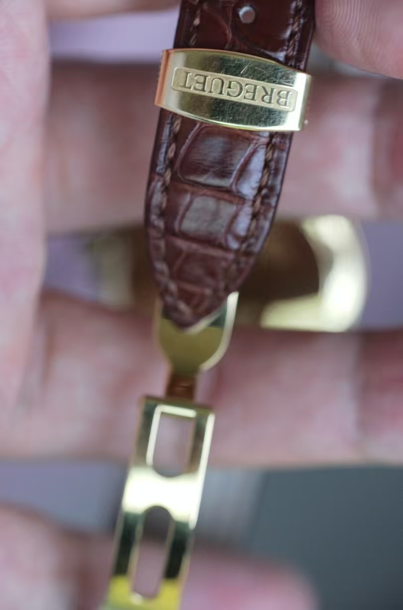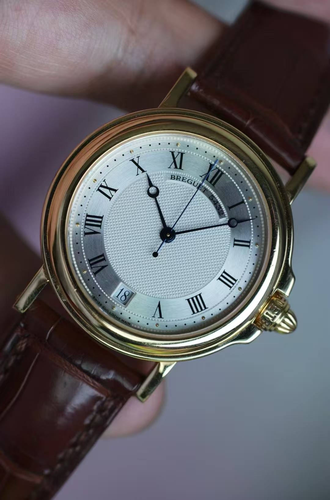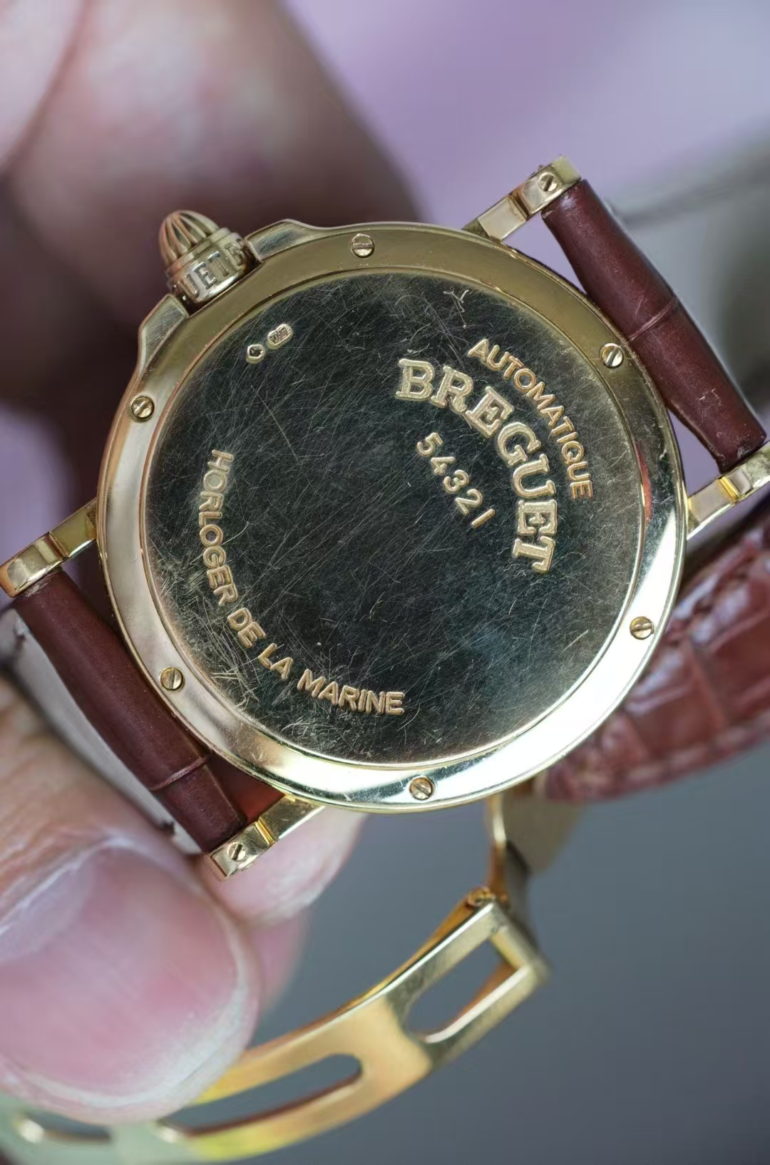 首页 > 宝玑|Breguet宝玑航海系列3400J型号,2000年前后作品。自动机械机芯,18K黄金材质,表径35.5毫米。集合了宝玑几大经典元素,宝玑针,玑镂纹雕花表盘,规范圈罗马刻度,表壳侧面钱币纹,区别于现代款的子弹型表冠。瞬跳日历,折叠扣款。整表85克左右,品相完美,单表好价出