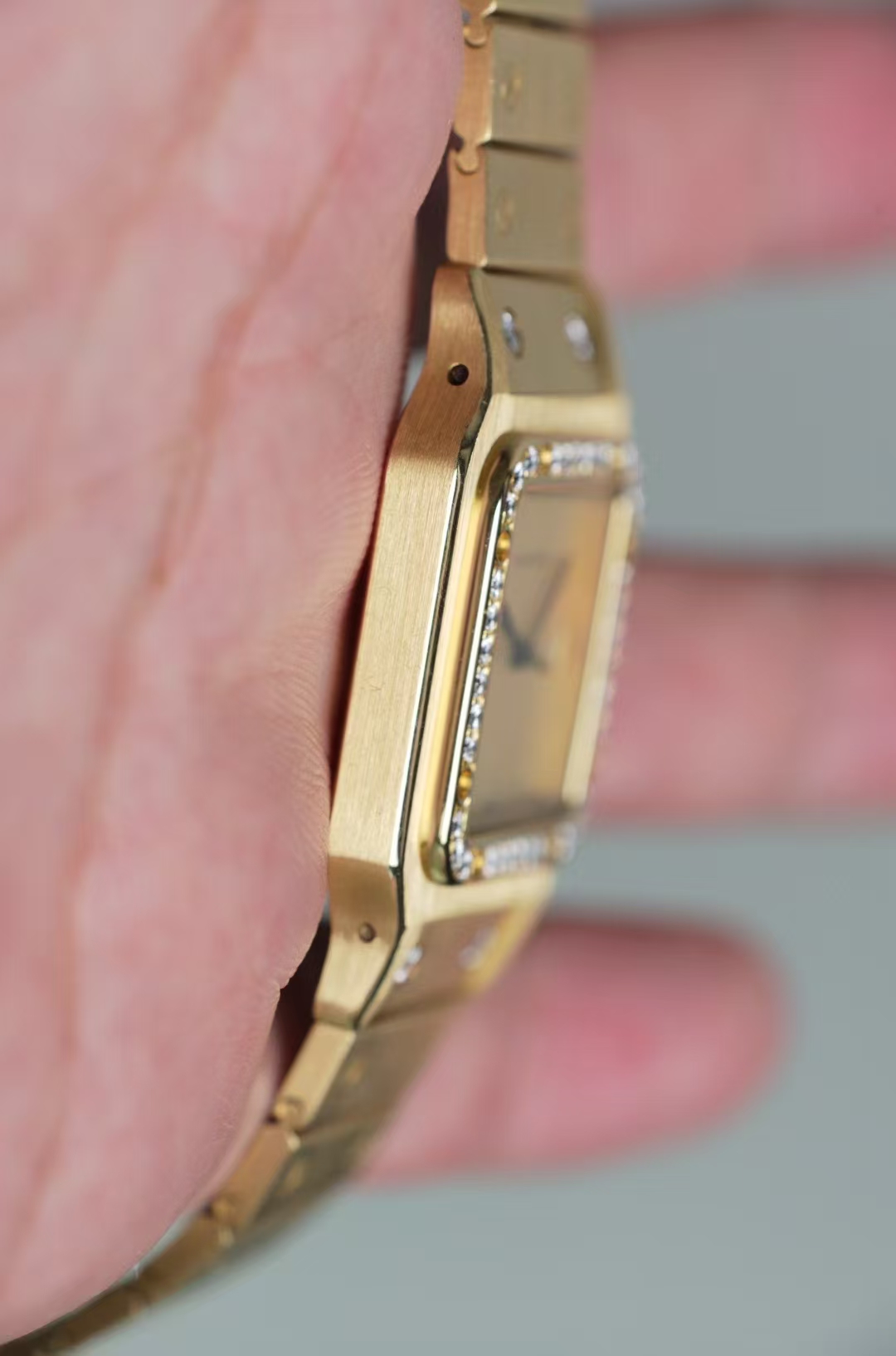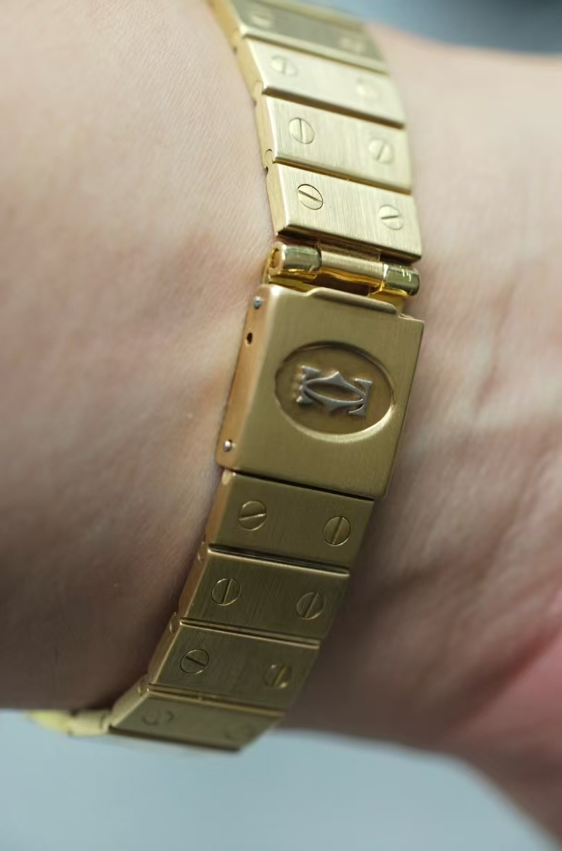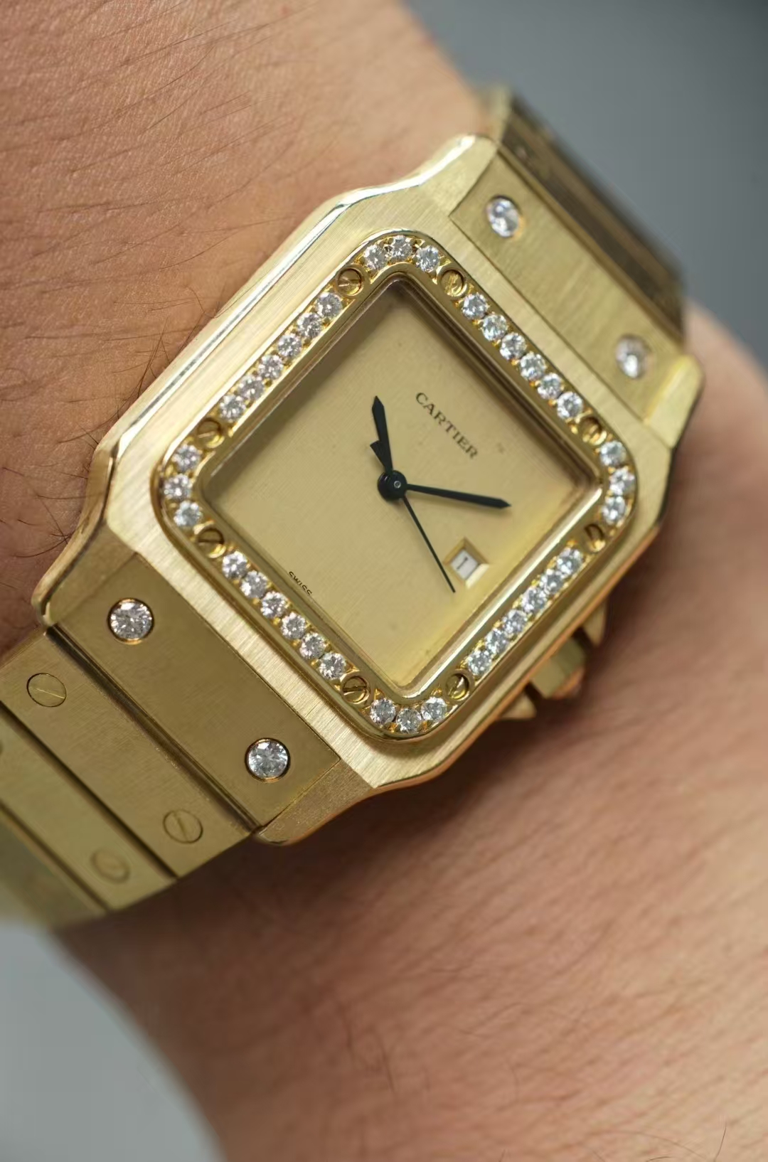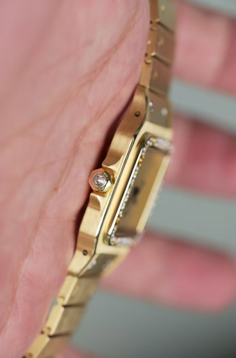 首页 > 卡地亚|CartierSANTOS DE CARTIER 卡地亚山度士2960,自动机械 29X41mm表径 整表18K黄金 原镶钻 无字天书面 盘面自然氧化 腕周190mm 整表139克 全贵金属原钻的山度士存量很少 可遇不可求