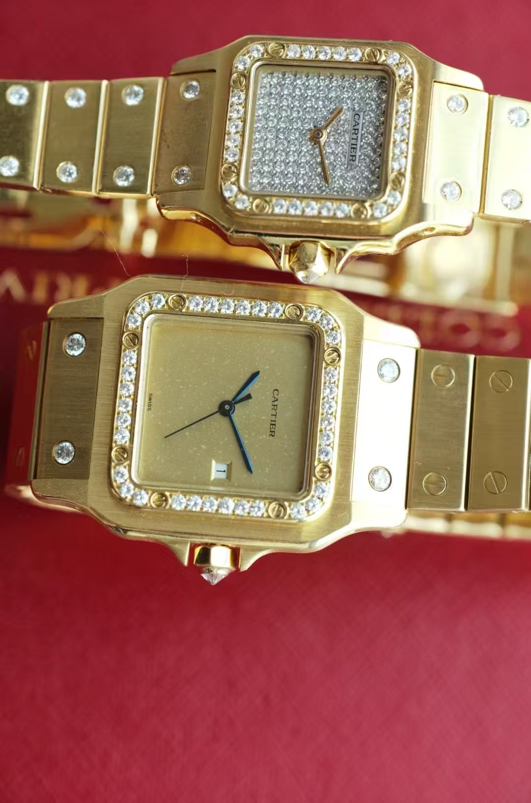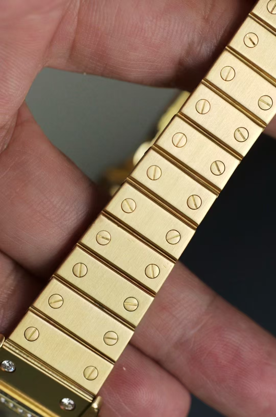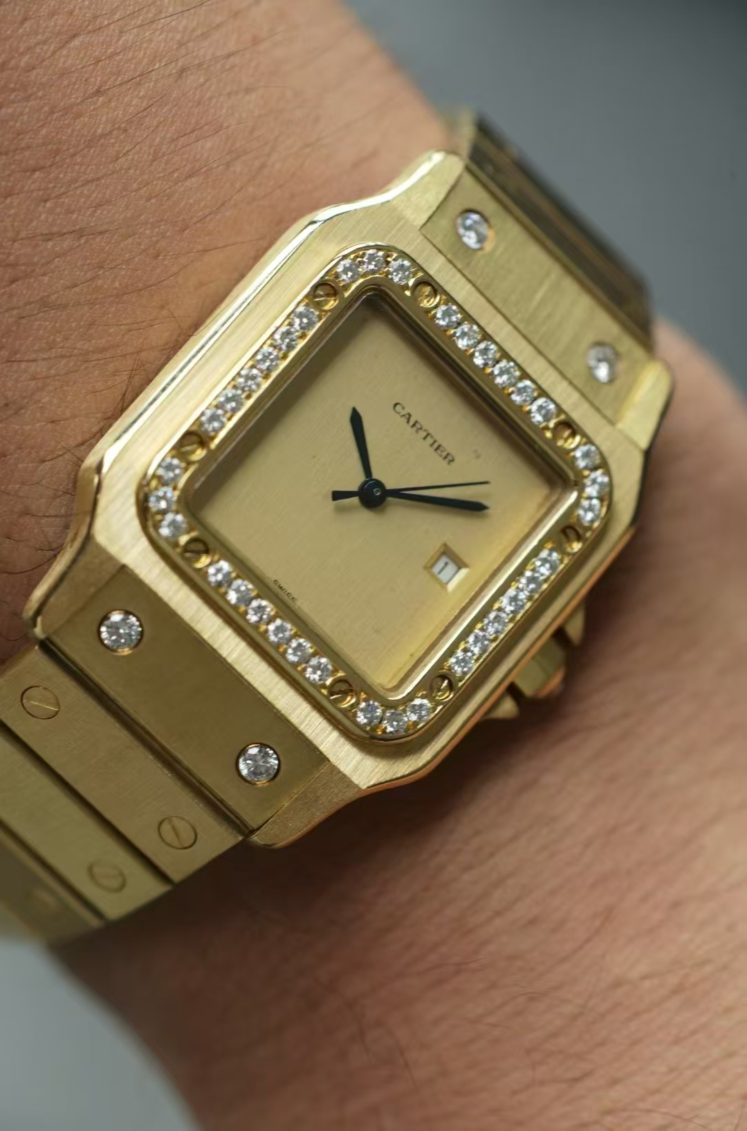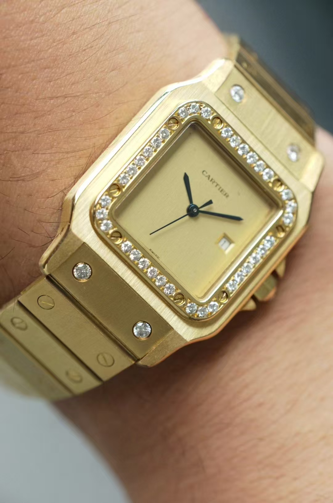 首页 > 卡地亚|CartierSANTOS DE CARTIER 卡地亚山度士2960,自动机械 29X41mm表径 整表18K黄金 原镶钻 无字天书面 盘面自然氧化 腕周190mm 整表139克 全贵金属原钻的山度士存量很少 可遇不可求