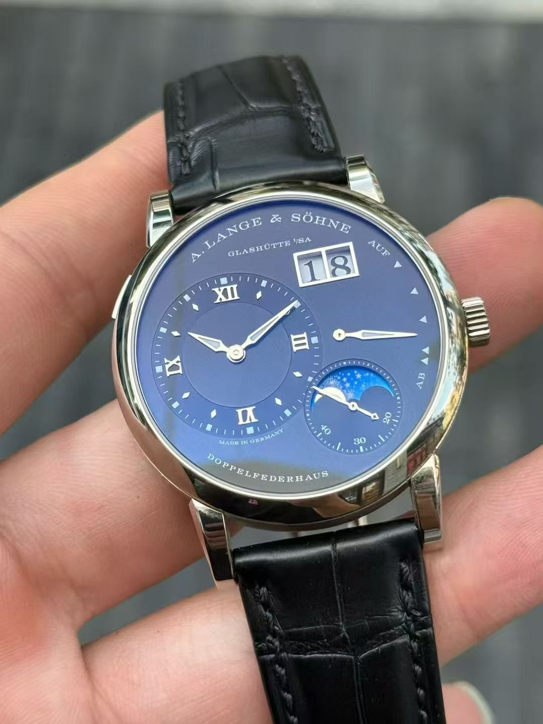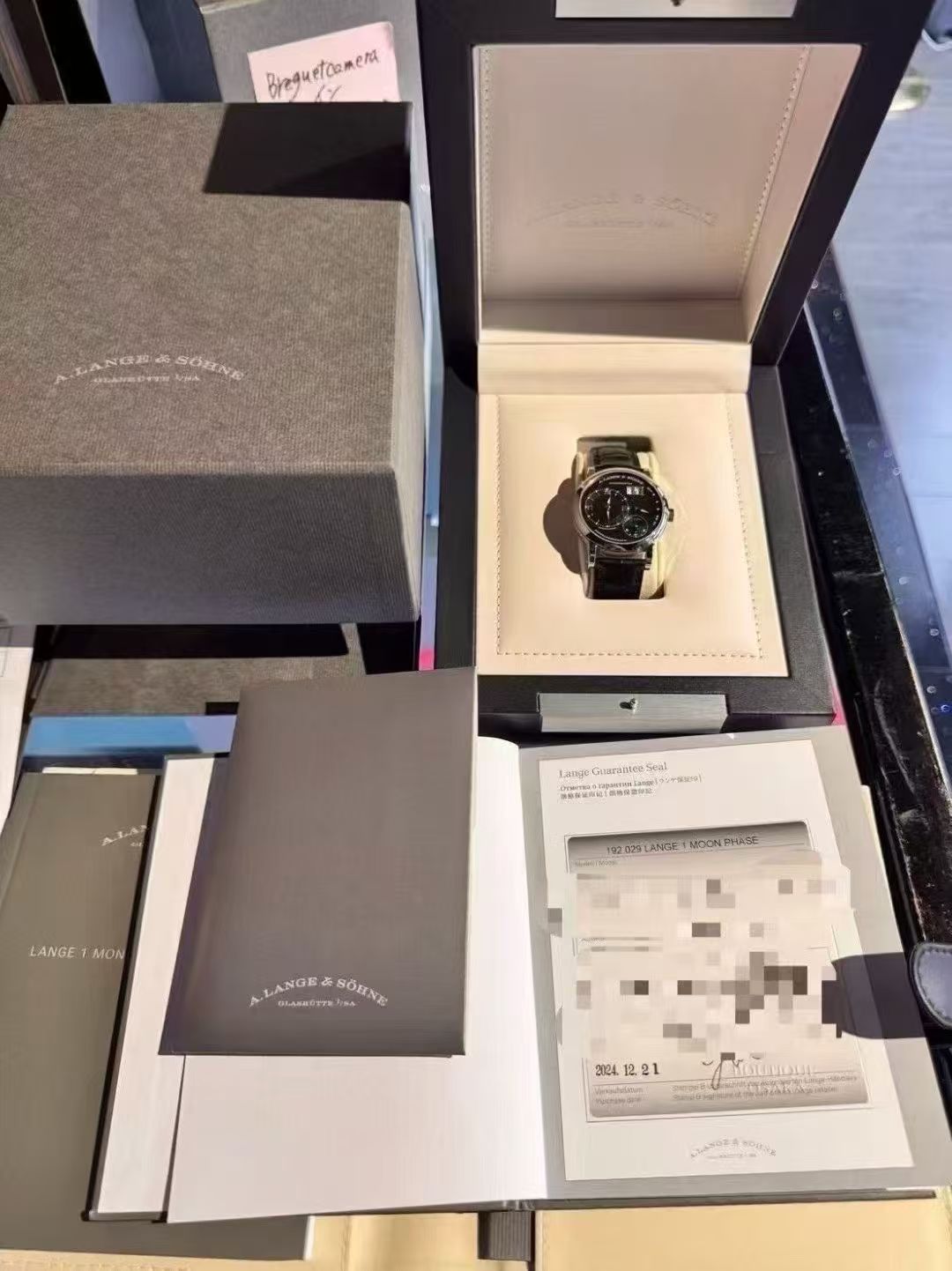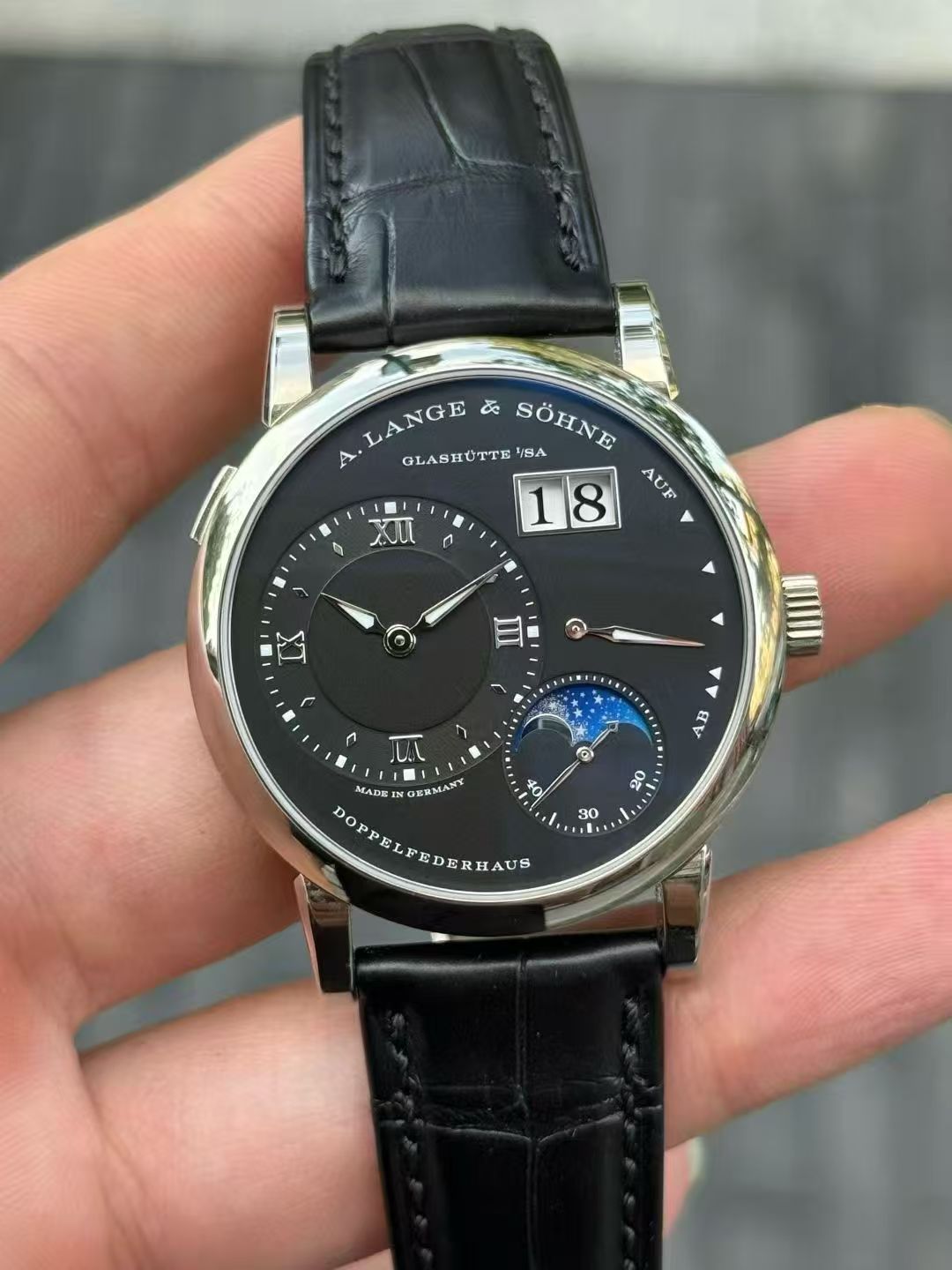 首页 > 朗格|A. Lange & Söhne朗格1号系列192.029,24年12月全套。白金黑面,新款昼夜月相同窗显示,夜光指针刻度,18K白金折叠表扣!!!公价418000,产量稀少,上手无敌好看