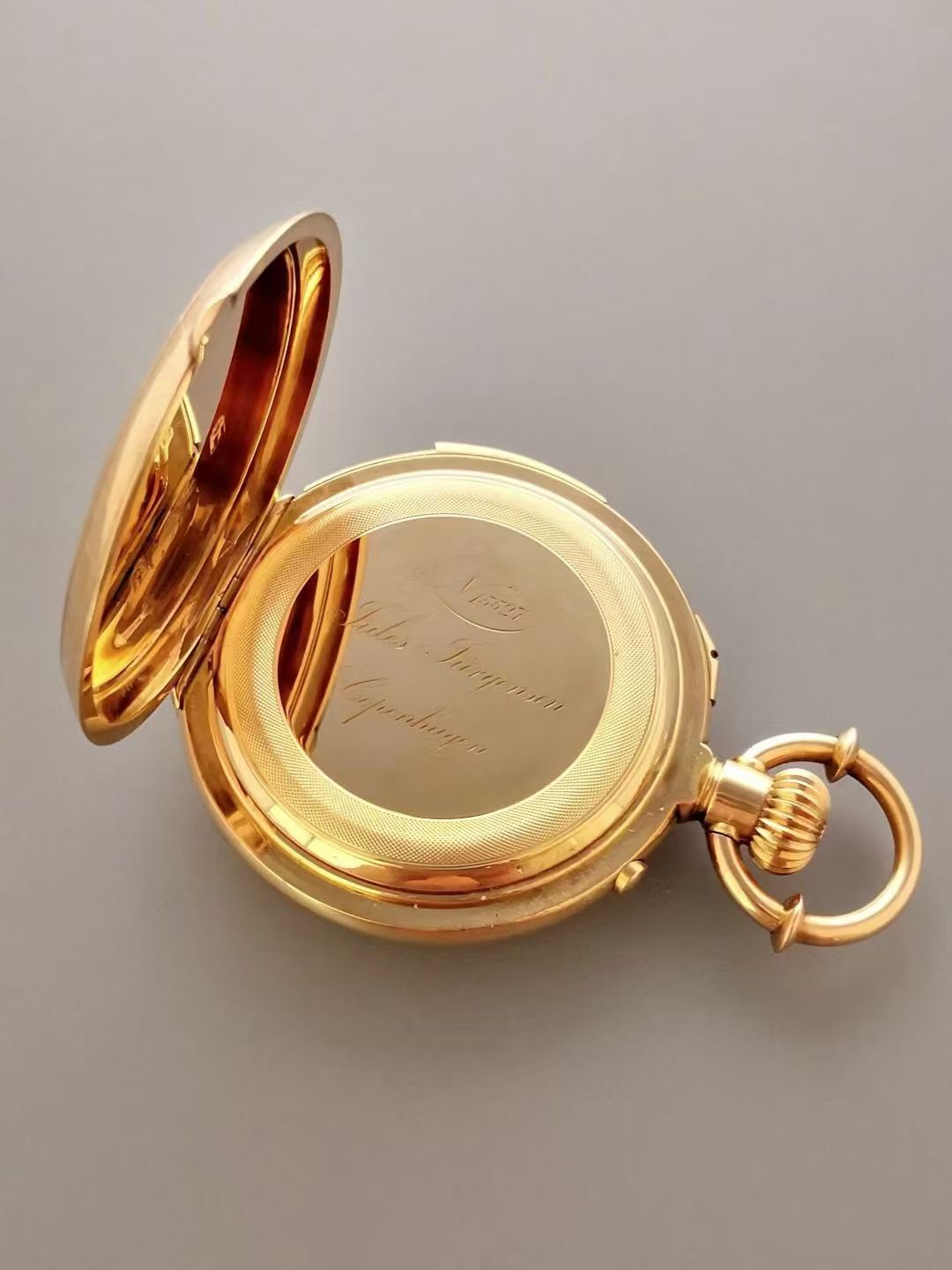 首页 > 其他品牌古董怀表:瑞士Jules Jürgensen追针三问,18K金53㎜表径,珐琅盘蓝钢针,累计30分钟追针计时,开关锁止,两锤两簧三问报时,专利把环调时,高等级机芯,品牌经典款,品相完美,按键柔和,报时清亮,难得赏玩收藏佳品。